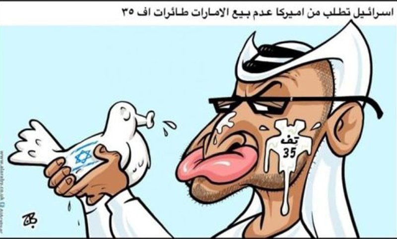 কার্টুনে দেখা যায়, পায়রাটি মোহাম্মদ বিন জায়েদের মুখে থুতু নিক্ষেপ করছে। এতে আরবি ভাষার ক্যাপশনে লেখা, যুক্তরাষ্ট্র থেকে আমিরাতের এফ-৩৫ বিমান ক্রয়ের বিরোধিতা করছে ইসরায়েল।