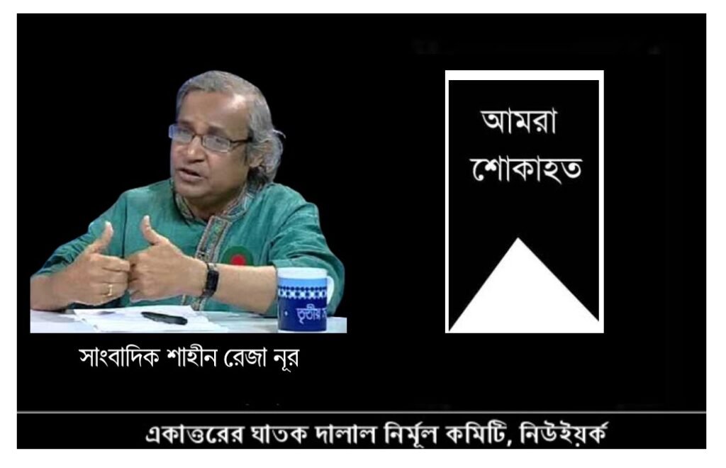 আমরা সাংবাদিক শাহীন রেজা নূরের অকাল মৃত্যুতে শোকাহত ও মর্মাহত। এই কঠিন সময়ে  একাত্তরের ঘাতক দালাল নির্মূল কমিটি নিউইয়র্ক চ্যাপাটের সভাপতি ফাহিম রেজা নূর সহ পরিবারের সবার প্রতি সমবেদনা জ্ঞাপন করছি। সাথে সাথে বাংলাদেশ সরকারের কাছে অনুরোধ করছি শাহীন রেজা নূরের মরদেহ দেশে নিয়ে যেন বুদ্ধিজীবী গোরস্তানে দাফন করা হয় তার যতাযত ব্যবস্থা করার হয় ।