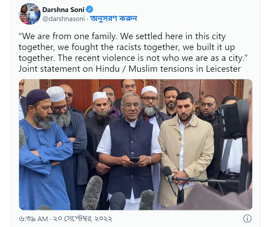 যৌথ বিবৃতিতে বলা হয়, ‘আমরা, লিস্টারের বাসিন্দারা আজ আপনাদের সামনে হিন্দু বা মুসলিম হিসাবে নয়, ভাই-বোন হিসাবে দাঁড়িয়ে আছি।’ লিস্টারে বিভেদমূলক শক্তির কোনও স্থান নেই বলেও বিবৃতিতে বলা হয়েছে।