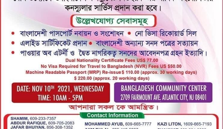 বাংলাদেশ এসোসিয়েশন অব সাউথ জারসি ও বাংলাদেশ কমিউনিটি সেন্টার এর যৌথ উদ্যোগে তাদের নিয়মিত সাংগঠনিক কার্যক্রমের অংশ হিসাবে আটলান্টিক সিটির ২৭০৯, ফেয়ারমাউনট এভিনিউর বাংলাদেশ কমিউনিটি সেন্টারে নিউইয়র্ক এ অবস্থিত বাংলাদেশ কনস্যুলেট এর সহযোগীতায় ভ্রাম্যমাণ কনস্যুলেট সেবা প্রদান করা হবে।