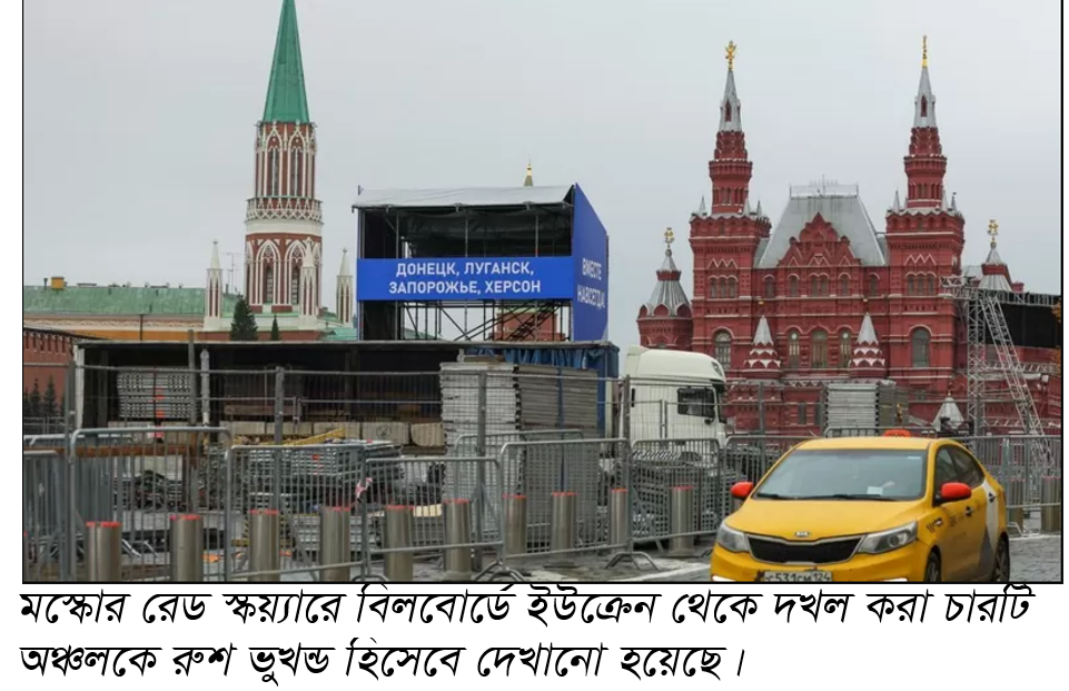 মস্কোর রেড স্কয়্যারে বিলবোর্ডে ইউক্রেন থেকে দখল করা চারটি অঞ্চলকে রুশ ভুখন্ড হিসেবে দেখানো হয়েছে।