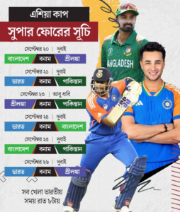 প্রথম দিন, অর্থাৎ ২০ সেপ্টেম্বর মুখোমুখি হবে বাংলাদেশ এবং শ্রীলঙ্কা। ২১ সেপ্টেম্বর ভারত-পাকিস্তান ম্যাচ। ২২ সেপ্টেম্বর কোনও খেলা নেই। ২৩ সেপ্টেম্বর শ্রীলঙ্কার মুখোমুখি হবে পাকিস্তান। ২৪ সেপ্টেম্বর ভারতের প্রতিপক্ষ বাংলাদেশ। ২৫ সেপ্টেম্বর বাংলাদেশের খেলা পাকিস্তানের সঙ্গে। পর পর দু’দিন ম্যাচ খেলতে হবে লিটন দাসের দলকে। সুপার ফোর পর্বের শেষ ম্যাচ ২৬ সেপ্টেম্বর। সে দিন ভারত-শ্রীলঙ্কা লড়াই। সুপার ফোর পর্বের সেরা দুই দল ফাইনালে উঠবে। ২৮ সেপ্টেম্বর, দুবাইয়ে এশিয়া কাপের ফাইনাল। ভারত এবং পাকিস্তান দু’দলই ফাইনালে পৌঁছোলে এশিয়া কাপে তিন বার সূর্যকুমার যাদবেরা মুখোমুখি হবেন সলমন আলি আঘাদের।