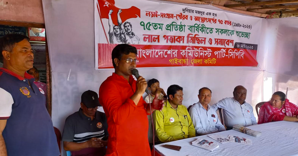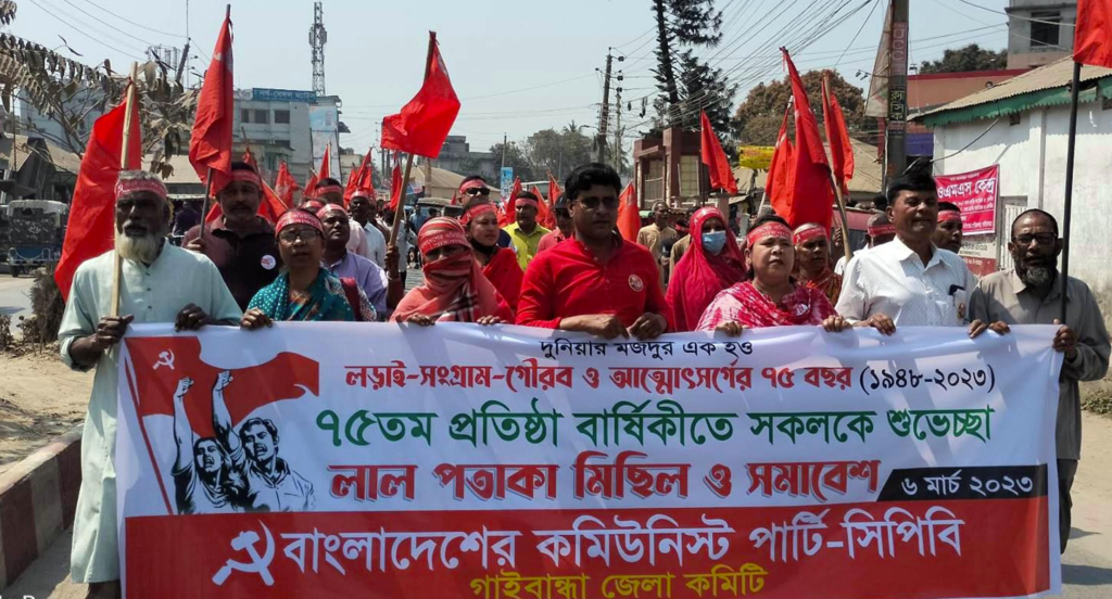 গাইবান্ধা প্রতিনিধি ঃ বাংলাদেশের কমিউনিস্ট পার্টি’র ৭৫তম প্রতিষ্ঠা বার্ষিকী পালিত হয়েছে। বাংলাদেশের উত্তরের জনপদ গাইবান্ধায় পার্টির প্রতিষ্ঠা বার্ষিকী উপলক্ষে লাল পতাকা মিছিল, সমাবেশ অনুষ্ঠিত হয়েছে।