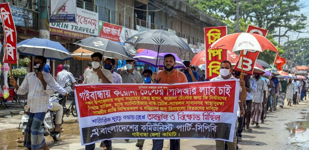 সোমবার সকাল ১১টায় শহরের ১নং রেল গেট থেকে মিছিল শুরু হয়ে শহরের প্রধান প্রধান সড়ক প্রদক্ষিণ করে ১নং ট্রফিক মোড়ে এসে শেষ হয়। মিছিল পূর্ব সংক্ষিপ্ত সমাবেশে বক্তব্য রাখেন জেলা কমিউনিস্ট পার্টির সভাপতি ও কেন্দ্রীয় কমিটির প্রেসিডিয়াম সদস্য মিহির ঘোষ, জেলা কমিউনিস্ট পার্টির সাধারণ সম্পাদক মোস্তাফিজুর রহমান মুকুল প্রমুখ। বক্তারা বলেন, করোনা মহামারির শুরু থেকে গাইবান্ধা জেলা ঝুঁকিপূর্ণ হিসেবে চিহ্নিত হলেও আজ পর্যন্ত করোনা টেস্টের ল্যাব স্থাপন না হওয়া দুঃখজনক। তারা অবিলম্বে গাইবান্ধা করোনা টেস্টিং পিসিআর ল্যাব স্থাপন এবং প্রত্যেক উপজেলায় করোনা রোগীর নমুনা সংগ্রহের কেন্দ্র স্থাপন করার দাবি জানান। সেই সাথে বিশ্বে কোন দেশ না করলেও বাংলাদেশ সরকার করোনা পরীক্ষার জন্য ফি নির্ধারণ করারও তীব্র নিন্দা জানান। এছাড়া করোনা মহামারির কারণে যখন বিশ্বে মানুষ কর্ম হারাচ্ছে তখন সরকারের রাষ্ট্রায়ত্ব পাটকল বন্ধের ঘোষণার তীব্র নিন্দা জানান বক্তারা।