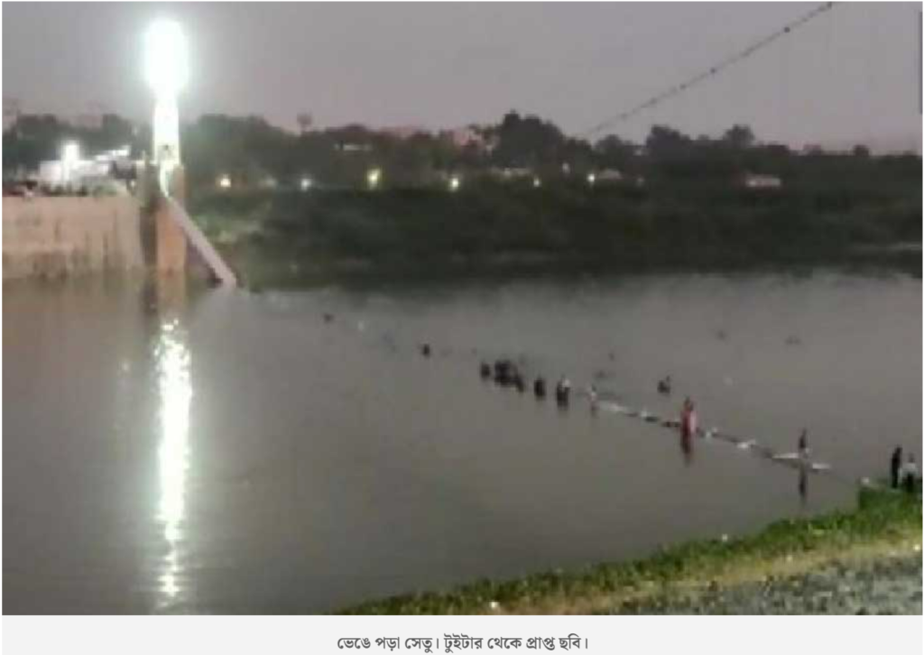 সন্ধান২৪.কম ডেস্ক: ভয়ংকর দুর্ঘটনা গুজরাটে । রাজ্যের মোরবি জেলার মচ্ছু নদীতে ভেঙে পড়ল একটি কেবল ব্রিজ । এখন পর্যন্ত ৩০ জনের বেশী দেহ উদ্ধার করা হয়েছে। ঘটনায় বহু মানুষের মৃত্যুর আশঙ্কা করা হচ্ছে। জানা গিয়েছে, দুর্ঘটনার সময় পাঁচ শতাধিক মানুষ ছিলেন ব্রিজটিতে। বেশ কিছু মানুষ নদীতে তলিয়ে গিয়েছে বলেও আশঙ্কা। মেরামতির চার দিনের মধ্যে বিপত্তি হল ব্রিজটিতে। উদ্ধার কাজে নেমেছে পুলিশ ও বিপর্যয় মোকাবিলা বাহিনী। তবে এখনও কোনও মানুষের মৃত্যুর কথা জানা যায়নি।