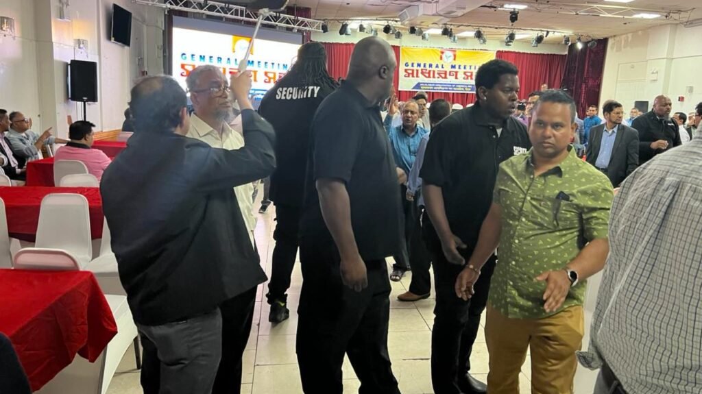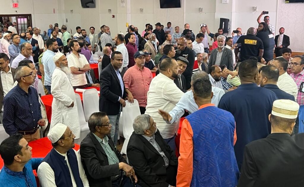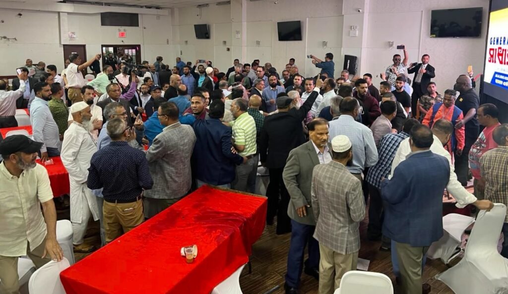 ১১ জুন রোববার কুইন্সের কুইন্স প্লাজায় অনুষ্ঠিত সাধারন সভা পরিস্থিতির কোন সমাধান এনে দেয়নি। বরং নাজুক করেছে। সভার শুরুতেই সাময়িক বহিস্কৃত সাধারন সম্পাদক মইনুল ইসলাম দলবল নিয়ে সভাস্থলে হৈচৈ শুরু করেন। সভাপতি বদরুল খান মাইক্রোফোন হাতে নিয়ে সভা পরিচালনা করার জন্য ভারপ্রাপ্ত সাধারন সম্পাদক রোকন হাকিমকে আহবান জানান। এ সময় ক্ষোভে ফেটে পড়েন মইনুল ইসলাম। তিনি পোডিয়ামের সামনে গিয়ে চিৎকার করে বলতে থাকেন, আমি নির্বাচিত সাধারন সম্পাদক। রোকনের ভারপ্রাপ্ততা অবৈধ। এ সময় মইনুলের কিছু সর্মথকও এগিয়ে আসেন। এক পর্যায়ে উভয় পক্ষের মধ্যে ধাক্কাধাক্কি শুরু হয়। মইনুল এক পর্যায়ে মাইকের ইলেকট্রিক তার ছিঁড়ে ফেলেন। শুরু হয় উভয় পক্ষের হাতাহাতি। কিছুটা পিছিয়ে আসেন মইনুল। রাগে ক্ষোভে তিনি দ্বিতীয় সারির টেবিলটি উল্টে ফেলে দেন। বদরুল খানের সর্মথকরা চড়াও হন মইনুল ও তার সর্মথক রনেলের ওপর। এক পর্যায়ে পুলিশের হস্তক্ষেপে মইনুল ইসলামকে হল থেকে বের করে দেয়া হয়। মইনুলকে অনুসরণ করেন তার সর্মথকরাও। বাইরে সমাবেশ করে তাঁরা সাধারণ সভাকে অবৈধ উল্লেখ করে ১৮ জুন রোববার সন্ধ্যায় কুইন্স প্যালেসে আরেকটি সাধারণ সভা আহ্বান করেছেন।