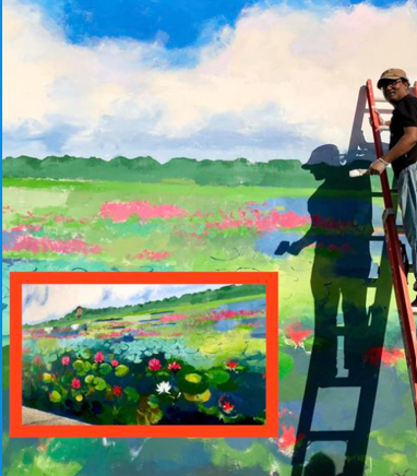তাজমহল পার্টি হলের রাস্তা সংলগ্ন দেয়ালে শিল্পী টিপু আলমের নির্মিত ৩২ বাই ২০ ফুট দীর্ঘ এই ম্যুরালটি এলাকায় ব্যাপক আলোড়ন সৃষ্টি করেছে। অ্যাক্রেলিকে আঁকা ম্যুরালটির বিষয় একটি শাপলা ঝিল। টলটলে জলে তাজা একগুচ্ছ শাপলা, যা দেখে কারও কারও মনে ফরাসি চিত্রকর ক্লদ মোনের আঁকা শাপলা ঝিলের কথা মনে পড়বে। টিপু আলমের ম্যুরালটির উপরিভাগজুড়ে রয়েছে বিস্তীর্ণ শরতের আকাশ, তার রং হালকা নীল ও সাদা। বাঙালির চোখে এই আকাশ শুধু তার নিজস্ব, তার একার।