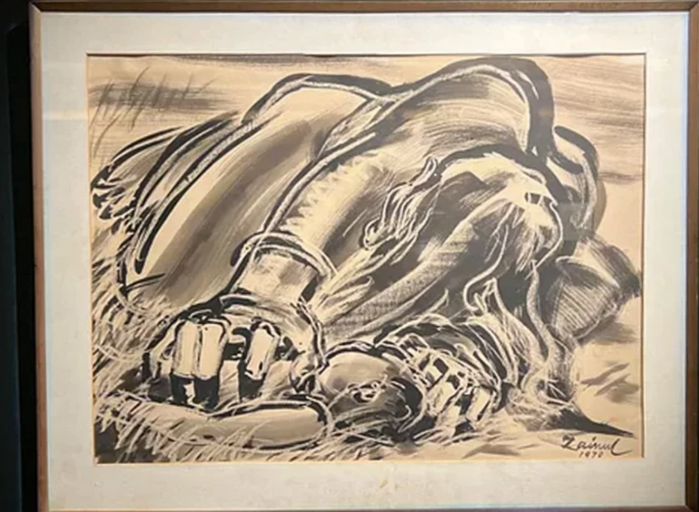 চিত্রকর্মটি শিল্পী জয়নুল আবেদিনের পক্ষ থেকে চেদোমিল প্লাজেককে উপহার দেওয়া হয়েছিল। বর্ণনা অনুযায়ী, এটি কাগজের ওপর কালির আঁচড়ে আঁকা এবং নিচের ডানদিকে ‘জয়নুল/১৯৭০’ স্বাক্ষর ও তারিখযুক্ত।