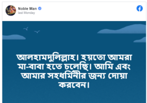 গত ২৮ জুন বিতর্কিত নোবেল ফেসবুকে ‘সুসংবাদ’ দিয়েছিলেন। জানিয়েছিলেন, তাঁদের জীবনে আসতে পারে নতুন অতিথি। ফেসবুকে লিখেছিলেন, ‘হয়তো আমরা মা-বাবা হতে চলেছি। আমার এবং আমার সহধর্মিণীর জন্য দোয়া করবেন।’ মুহূর্তেই নেটমাধ্যমে ছড়িয়ে পড়ে নোবেলের পোস্ট। শুভেচ্ছা বার্তায় ভরে যায় মন্তব্য বাক্স।