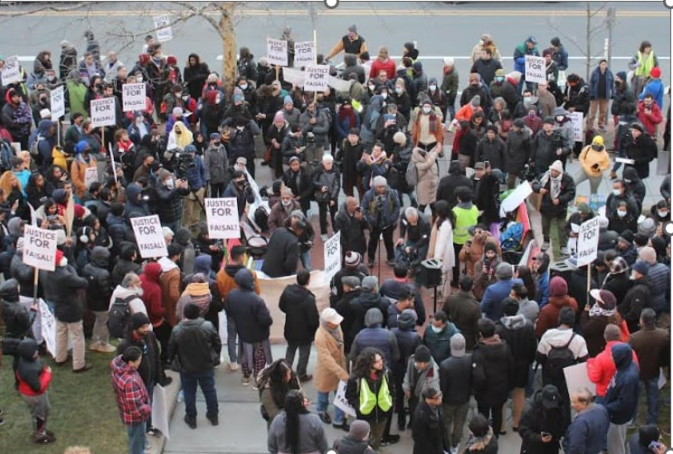 ফয়সল হত্যার সুষ্ঠু তদন্ত ও দোষীদের বিচার দাবিতে সোমবার (৯ জানুয়ারি) ম্যাসাচুসেটস অঙ্গরাজ্যের বোস্টনের ক্যামব্রিজ সিটি হলের সামনে বিক্ষোভ করেন বিভিন্ন কমিউনিটির শত শত মানুষ।