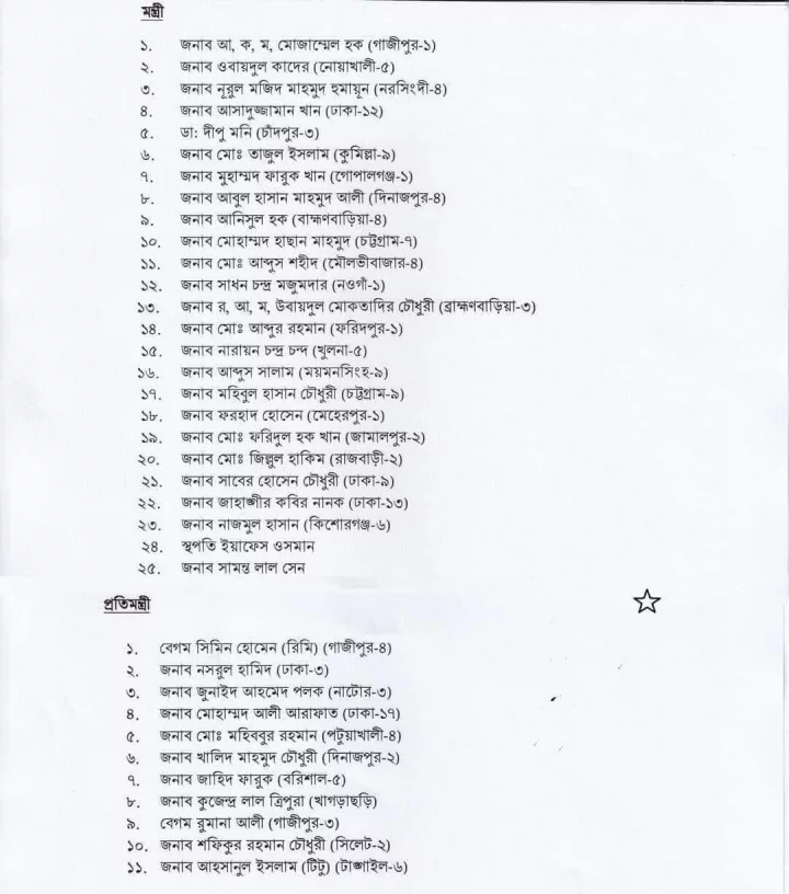 মন্ত্রী হিসেবে যারা নতুন ডাক পেয়েছেন: মো. আব্দুস শহীদ (মৌলভীবাজার-৪), র. আ. ম. উবায়দুল মোকতাদির চৌধুরী (ব্রাহ্মণবাড়িয়া-৩), মো. আব্দুর রহমান (ফরিদপুর-১), আব্দুস সালাম (ময়মনসিংহ-৯), মো. জিল্লুল হাকিম (রাজবাড়ী-২), জনাব নাজমুল হাসান (কিশোরগঞ্জ-৬), সামন্ত লাল সেন।