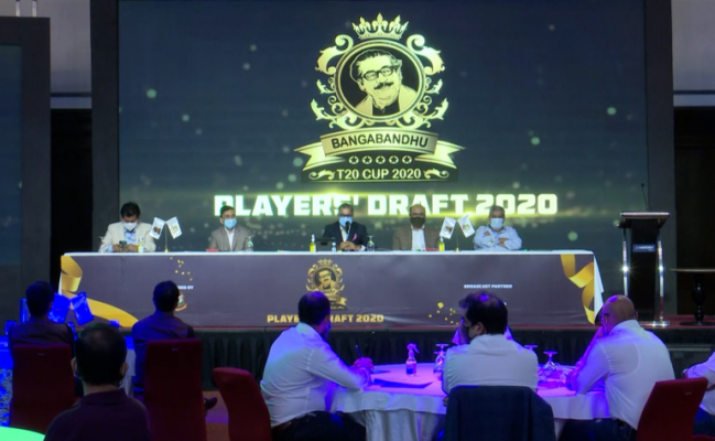 সন্ধান২৪.কম : ১১ নভেম্বর দুপুরে রাজধানীর স্থনীয় একটি হোটেলে ড্রাফটের মাধ্যমে নিজ নিজ দল গঠন করে টুর্নামেন্টে অংশগ্রহণকারী ৫ দল। চলতি মাসের তৃতীয় সপ্তাহে অনুষ্ঠেয় বঙ্গবন্ধু টি-২০ কাপ সামনে রেখে শেষ হলো পাঁচ দলের প্লেয়ার্স ড্রাফট। বিসিবির ঘোষণা অনুযায়ী প্রতিটি দল ড্রাফট থেকে ১৬ জন করে ক্রিকেটার নিতে পেরেছে। বঙ্গবন্ধু টি-২০ কাপের প্লেয়ার্স ড্রাফটে প্রথম ডাকার সুযোগ পেয়ে বেক্সিমকো ঢাকা মুশফিকুর রহিমকে দলে ভিড়ায়। জেমকন খুলনা দলে নেয় সাকিব আল হাসানকে। এরপর ফরচুন বরিশাল নেয় তামিম ইকবালকে। চার ও পাঁচে খেলোয়াড় ডাক দেয়ার সুযোগ পেয়ে গাজী গ্রুপ চট্টগ্রাম ও মিনিস্টার গ্রুপ রাজশাহী নেয় মোস্তাফিজুর রহমান ও মোহাম্মদ সাইফ উদ্দিনকে।