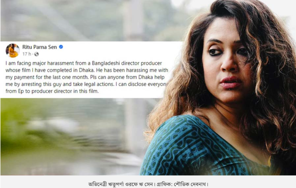 সন্ধান২৪.কম ডেস্ক: একটি সিনেমার শুটিংয়ে গিয়েছিলেন বাংলাদেশে । অভিনেত্রী ঋতুপর্ণা ওরফে ঋ সেন গত জানুয়ারি মাসে শুটিং শেষ করে ভাল ভাবেই কলকাতায় ফিরেছেন । কিন্তু তার পর থেকে বাধল গন্ডগোল। শুটিং শেষ করে ফিরে এলেও বকেয়া পারিশ্রমিক পাননি অভিনেত্রী। অপেক্ষা করেছেন প্রায় দেড় মাস। অগণিত বার ফোন করেছেন ছবির পরিচালক তথা প্রযোজককে। উত্তর মেলেনি। তিনি ঋতুপর্ণার ফোনই ধরেননি। শেষমেশ ধৈর্যচ্যুতি ঘটে অভিনেত্রীর। বাংলাদেশের ওই প্রযোজকের প্রতি হেনস্থার অভিযোগ এনে ফেসবুকে ক্ষোভ উগরে দেন। তবে ঠিক কী ঘটেছে তাঁর সঙ্গে, আনন্দবাজার অনলাইনকে জানালেন অভিনেত্রী।