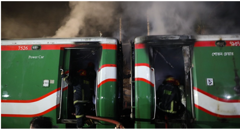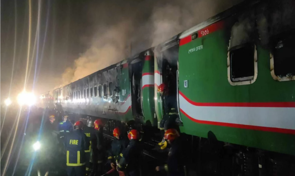 সন্ধান২৪.কম: রাজধানীর গোপীবাগে বেনাপোল এক্সপ্রেস (৭৯৫) ট্রেনে আগুন দেওয়ার ঘটনা ঘটেছে। ফায়ার সার্ভিস, বিজিবি ও র্যাবের প্রায় দুই ঘণ্টার চেষ্টায় আগুন নিয়ন্ত্রণে আসে। এ ঘটনায় ট্রেন থেকে ৪ জনের মরদেহ উদ্ধার করা হয়েছে। আহত হয়েছে বেশ কয়েকজন। তাদের শেখ হাসিনা বার্ন ইউনিটে ভর্তি করা হয়েছে।