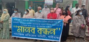 সন্ধান২৪.কমঃ রাজধানী ঢাকার গুলশানে কলেজ ছাত্রী মোসারাত জাহান মুনিয়ার রহস্যজনক মৃত্যুর পর চরিত্র হননের ষড়যন্ত্র বন্ধসহ নিরপেক্ষ ও প্রভাবমুক্ত তদন্ত এবং সুষ্ঠু বিচারের দাবিতে ৫ মে বুধবারগাইবান্ধা জেলা সামাজিক প্রতিরোধ কমিটির উদ্যোগে এক মানববন্ধন অনুষ্ঠিত হয়। জেলা শহরের ডিবি রোডে আয়োজিত এই সমাবেশ থেকে অবিলম্বে আসামী সায়েম সোবহান আনভিরকে গ্রেফতারের দাবি জানান।