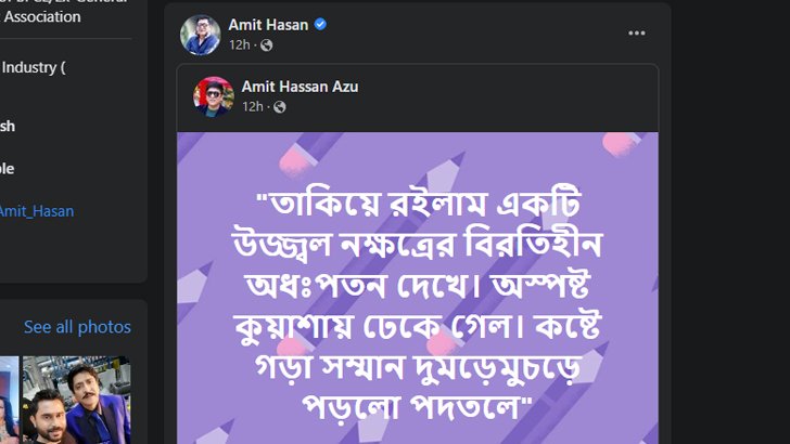 সবমিলিয়ে জায়েদ খানকে ঘিরে একই ছাদের তলার দুই বাসিন্দা ভিন্ন ভিন্ন বক্তব্যে চলচ্চিত্রের মানুষেরা যখন বিরক্ত ও বিব্রত, তখন ফেসবুকে রহস্যময় এক স্ট্যাটাস দিলেন আরেক জনপ্রিয় তারকা অমিত হাসান।