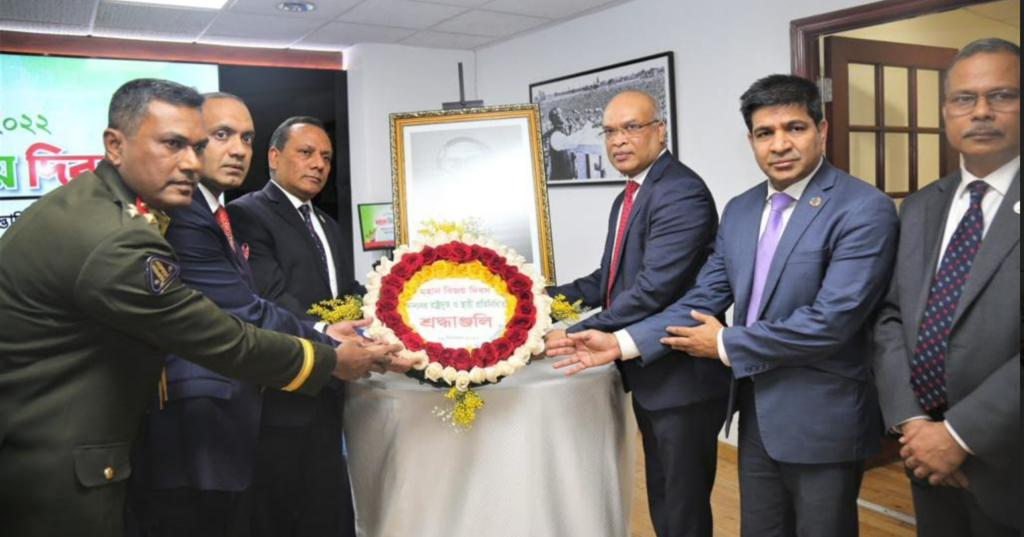 জাতিসংঘে বাংলাদেশ মিশন, ওয়াশিংটনে বাংলাদেশ দূতাবাস, নিউইয়র্কে বাংলাদেশ কন্স্যুলেট, যুক্তরাষ্ট্র আওয়ামী লীগ ও যুক্তরাষ্ট্র সেক্টর কমান্ডারস ফোরামের অনুষ্ঠানে একাত্তরের শহীদ মুক্তিযোদ্ধা এবং জাতির জনক বঙ্গবন্ধু শেখ মুজিব, জাতীয় চার নেতাসহ সকলের আত্মার প্রতি শ্রদ্ধা জানিয়ে এক মিনিট নিরবতা পালন করা হয়। জাতির জনকের প্রতিকৃতিতে শ্রদ্ধাঞ্জলিও অর্পণ করেন মুক্তিযোদ্ধা-সহ কূটনীতিক ও রাজনীতিকরা।