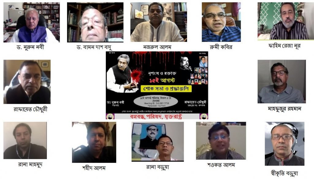 সন্ধান২৪.কম : যুক্তরাষ্ট্র বঙ্গবন্ধু পরিষদের উদ্যোগে পালিত হল জাতীয় শোকদিবস ও জাতির জনক বঙ্গবন্ধু শেখ মুজিবুর রহমানের মৃত্যু বার্ষিকী। ১৫ই আগষ্ট ২০২০, শনিবার অনলাইনে জুম-এর মাধ্যমে আয়োজিত আলোচনা সভায় স্বাধীন বাংলাদেশের স্থপতি বঙ্গবন্ধু শেখ মুজিবুর রহমান ও ১৯৭৫ সালের ১৫ই আগস্টে স্বাধীনতা বিরোধী খুনী চক্রের হাতে নিহত সকলের প্রতি শ্রদ্ধা জানানো হয়।