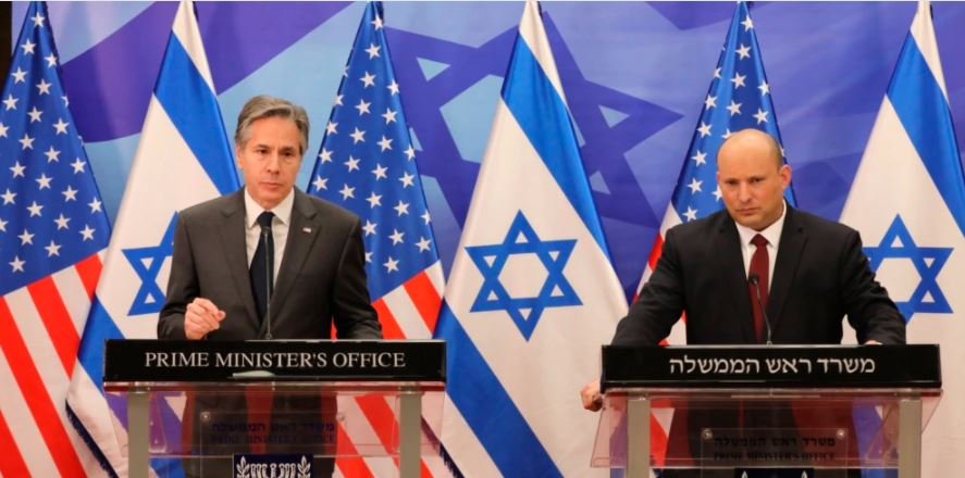 জেরুজালেমে ইসরায়েলের পররাষ্ট্র মন্ত্রকে একটি সংবাদ সম্মেলনে যুক্তরাষ্ট্রের পররাষ্ট্রমন্ত্রী অ্যান্টনি ব্লিংকেন এবং ইসরায়েলের প্রধানমন্ত্রী নাফতালি বেনেট। ২৭ মার্চ, ২০২২।
