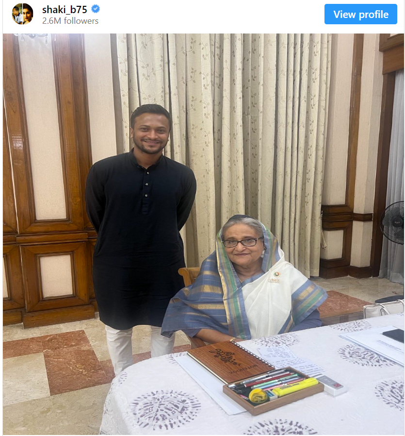 গত শুক্রবার হাসিনার সঙ্গে দেখা করতে যান শাকিব। শাকিবের সঙ্গে ছিলেন বাংলাদেশ ক্রিকেট বোর্ডের চেয়ারম্যান নাজমুল হাসান পাপন। দেশের ক্রিকেট নিয়ে কোনও আলোচনা করতে হয়তো প্রধানমন্ত্রীর কাছে গিয়েছিলেন শাকিবরা। কিন্তু সেই বিষয়ে কিছু জানা যায়নি। হাসিনার সঙ্গে তাঁর ছবি নিজের ইনস্টাগ্রামে দেন শাকিব।
